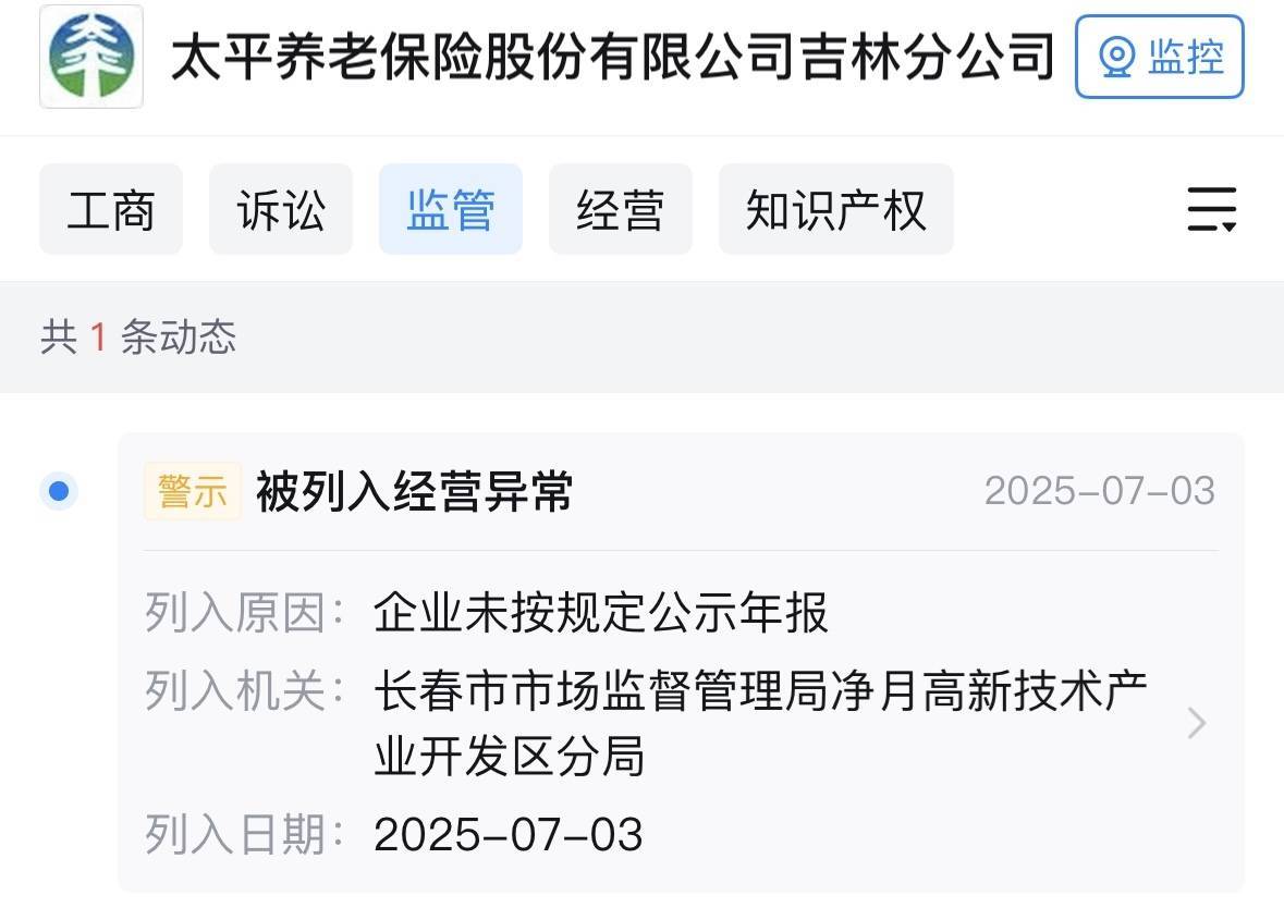 此外,据天眼查APP,太平养老保险股份有限公司吉林分公司还曾因未按规定公示年报被列入经营异常。